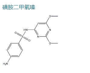 别名: 磺胺间二甲氧嘧啶; 4-氨基-N-(2,6-二甲氧基-4-嘧啶)苯磺酰胺; 磺胺二甲氧嘧啶; 高效磺胺; 磺胺地索辛; 磺胺间二甲氧基嘧啶