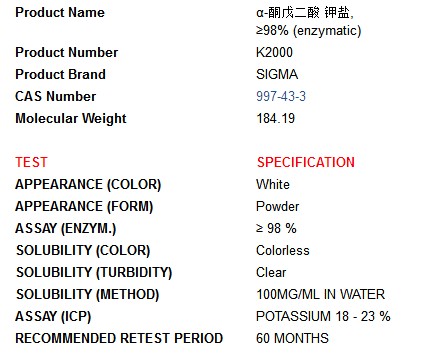 | 备注:别名: 2-氧化戊二酸 钾盐 storage temp:2-8°C |