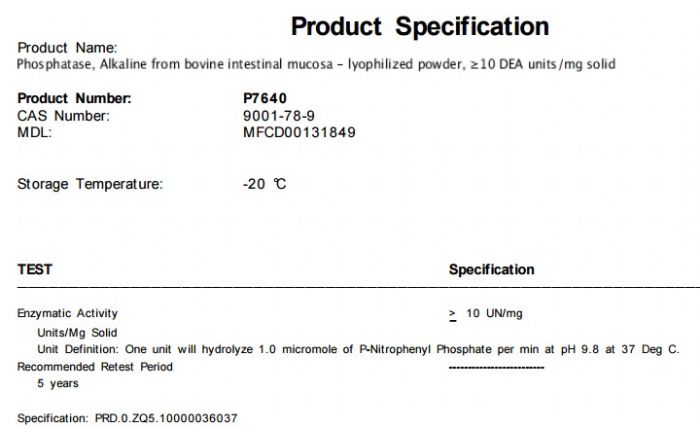 | 备注:碱性磷酸酯酶 storage temp: −20°C |