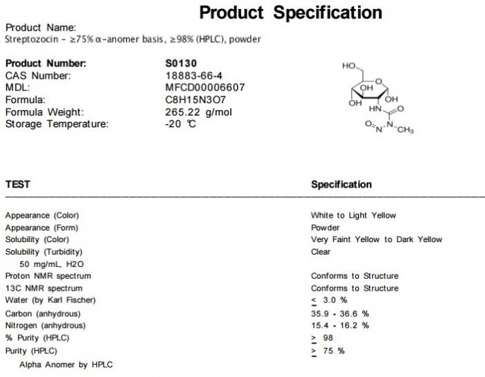 | 备注:别名: Streptozotocin 链脲霉素 storage temp: −20°C |