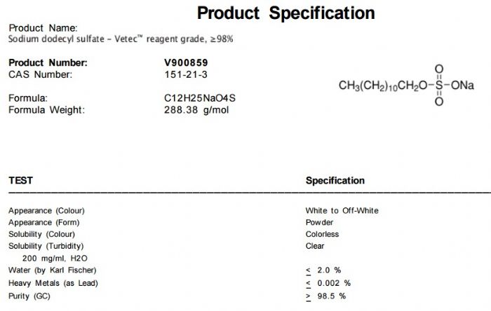 | 备注:别名: Dodecyl sodium sulfate Dodecyl sulfate 钠盐 SDS Sodium lauryl sulfate 月桂基硫酸盐 钠盐 常温保存 |