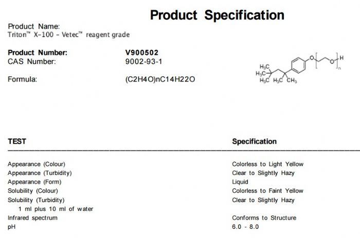 | 备注:别名: 4-(1,1,3,3-四甲基丁基)苯基-聚乙二醇 叔辛基苯氧基聚乙烯乙氧基乙醇 聚乙二醇叔辛基苯基醚 常温保存 |