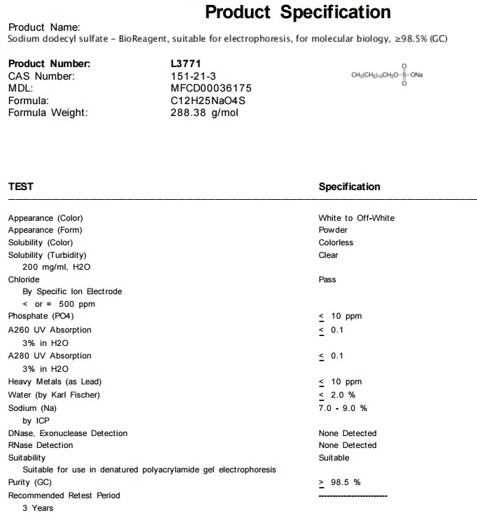 | 英文名称:Sodium dodecyl sulfate |