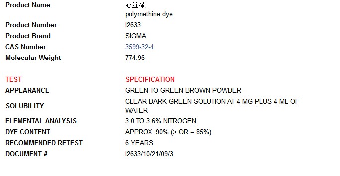 | 备注:别名: 吲哚菁绿 福氏绿 靛氰绿 常温保存 |