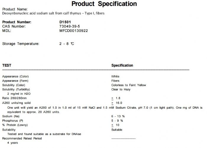 | 中文名称:脱氧核糖核酸 钠盐 来源于小牛胸腺 |