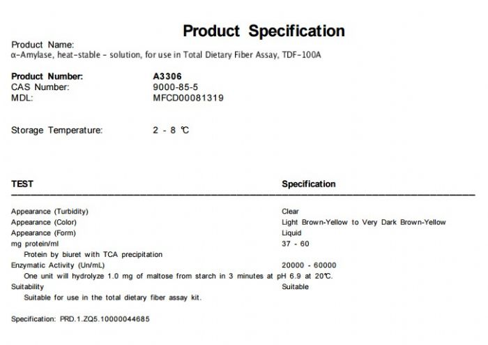 | 备注:solution, for use in Total Dietary Fiber Assay, TDF-100A storage temp. 2-8°C |