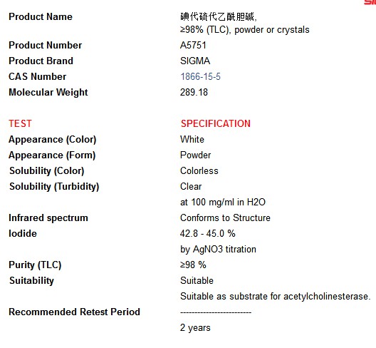 | 备注:≥98% (TLC), powder or crystals 分子式 CH3COSCH2CH2N(CH3)3I 分子量 289.18 storage temp:2-8°C |