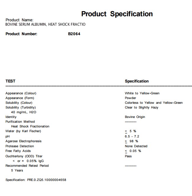 | 备注:heat shock fraction, Australia origin, protease free, low fatty acid, low IgG, pH 7, ≥98% |