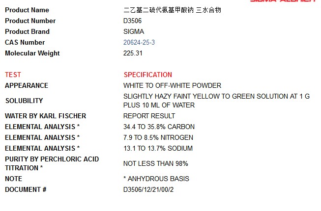 中文名称:二乙基二硫代氨基甲酸钠 三水合物 原货号:D3506