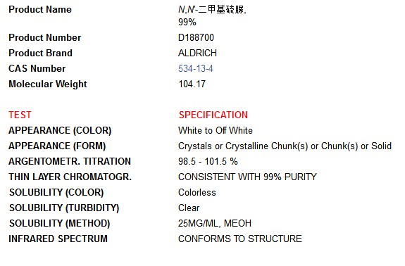 英文名称:N,N′-Dimethylthiourea 规格:100G