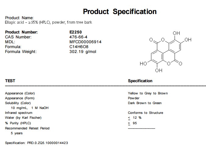 | 备注:别名: 4,4′,5,5′,6,6′-Hexahydroxydiphenic acid 2,6,2′,6′-dilactone 常温保存 |