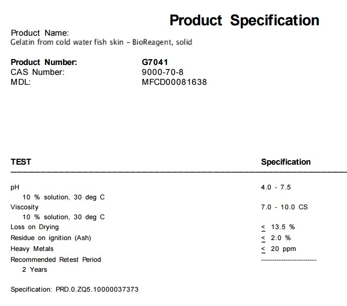 中文名称:明胶 来源于冷水鱼类的皮肤 原货号:G7041