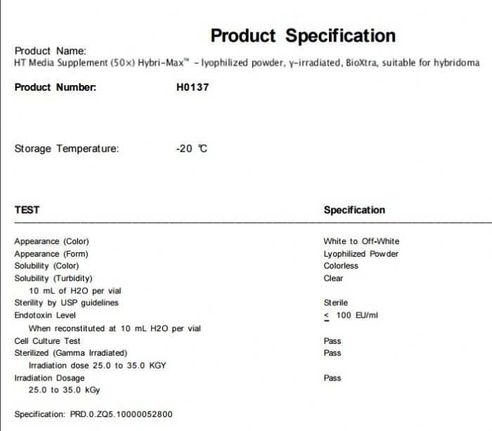 | 中文名称:HT 培养基添加剂 (50×) Hybri-Max™ |