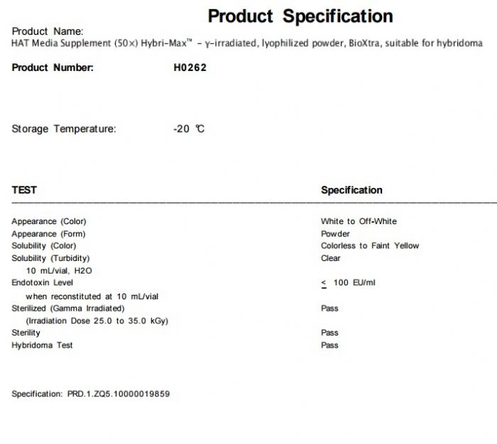 | 中文名称:HAT 培养基添加剂 (50×) Hybri-Max™ |