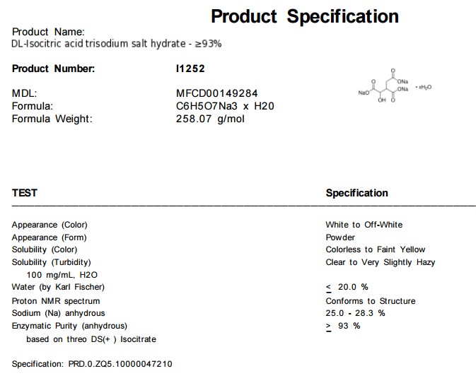 中文名称:DL-异柠檬酸 三钠盐 水合物 原货号:I1252