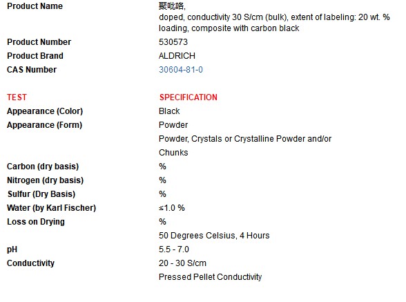 :掺杂电导率30 S / cm(散装),标签的范围:20 wt %加载,与炭黑复合